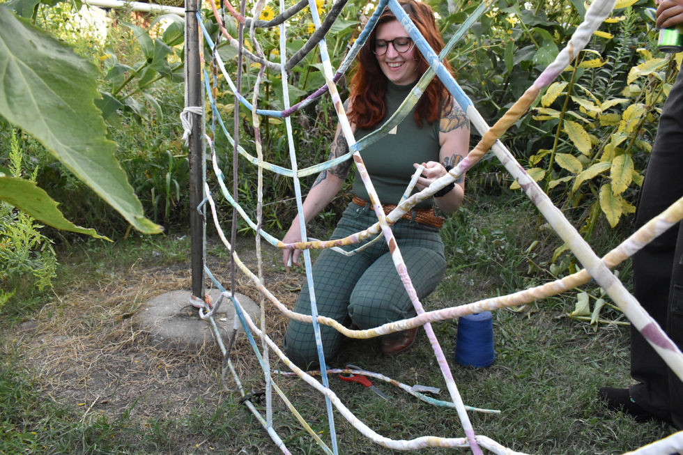 Continual Coweaving is built from remnants of past projects and experiments on textiles from Millicent Kennedy’s practice. It includes garment fragments, natural dye samples, and fabric remaining from completed artworks. All these separate parts are hand sewn into cords and rejoined weaving a web reminiscent of the orb weaver spider. Kennedy’s interest in spider webs is related to their impermanence and ongoing need of the spider to return to and repair them. For the spider this is a solo practice, but for people mending and rebuilding is a deeply communal practice if we hope to sustain these repairs. Over the course of this installation visitors are invited to add their own used textiles to the web, and share about the materials history.
